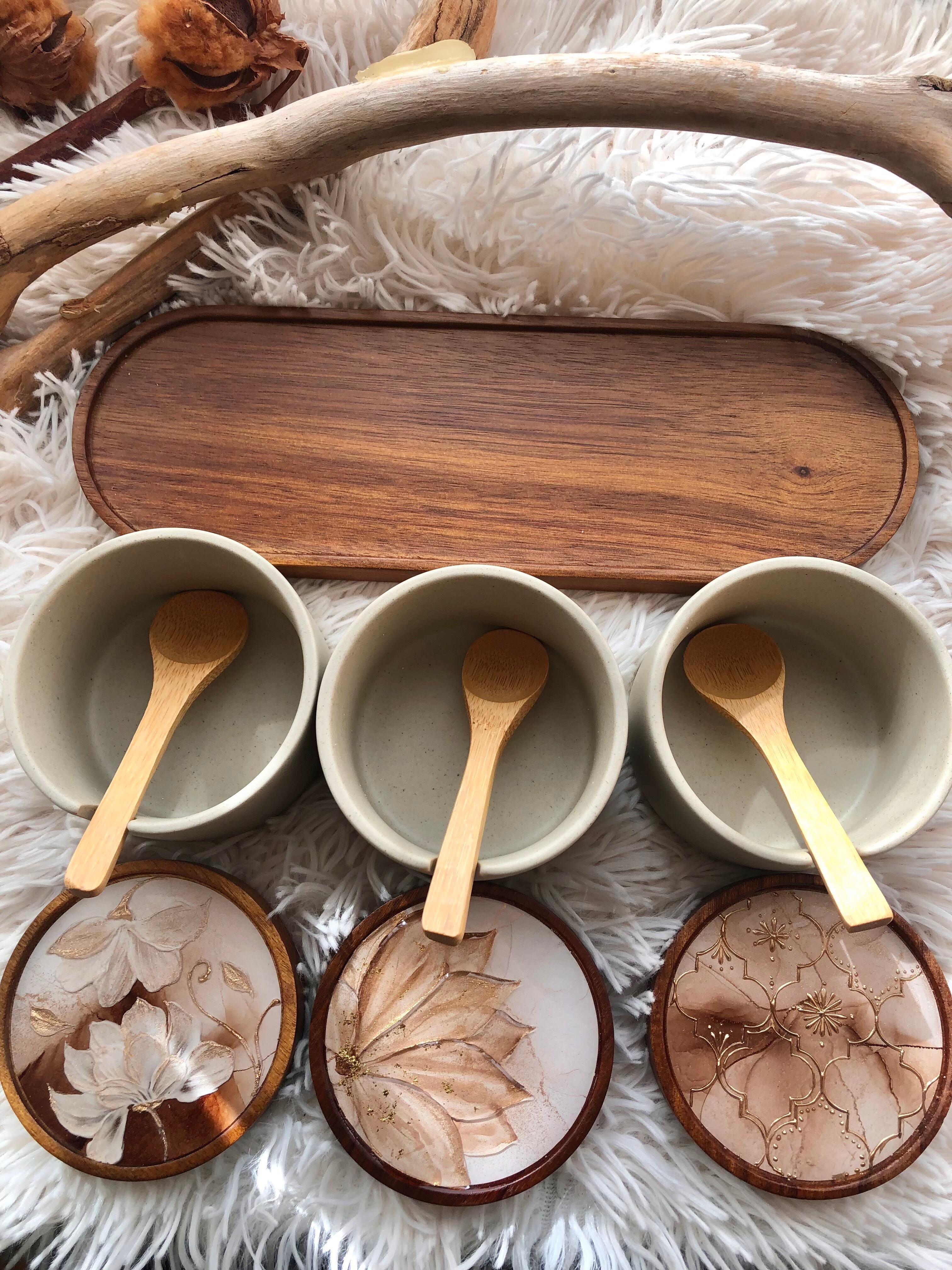 ナチュラルカラーの陶器に濃いめブラウンの木製蓋の調味料ボトルセットです♡