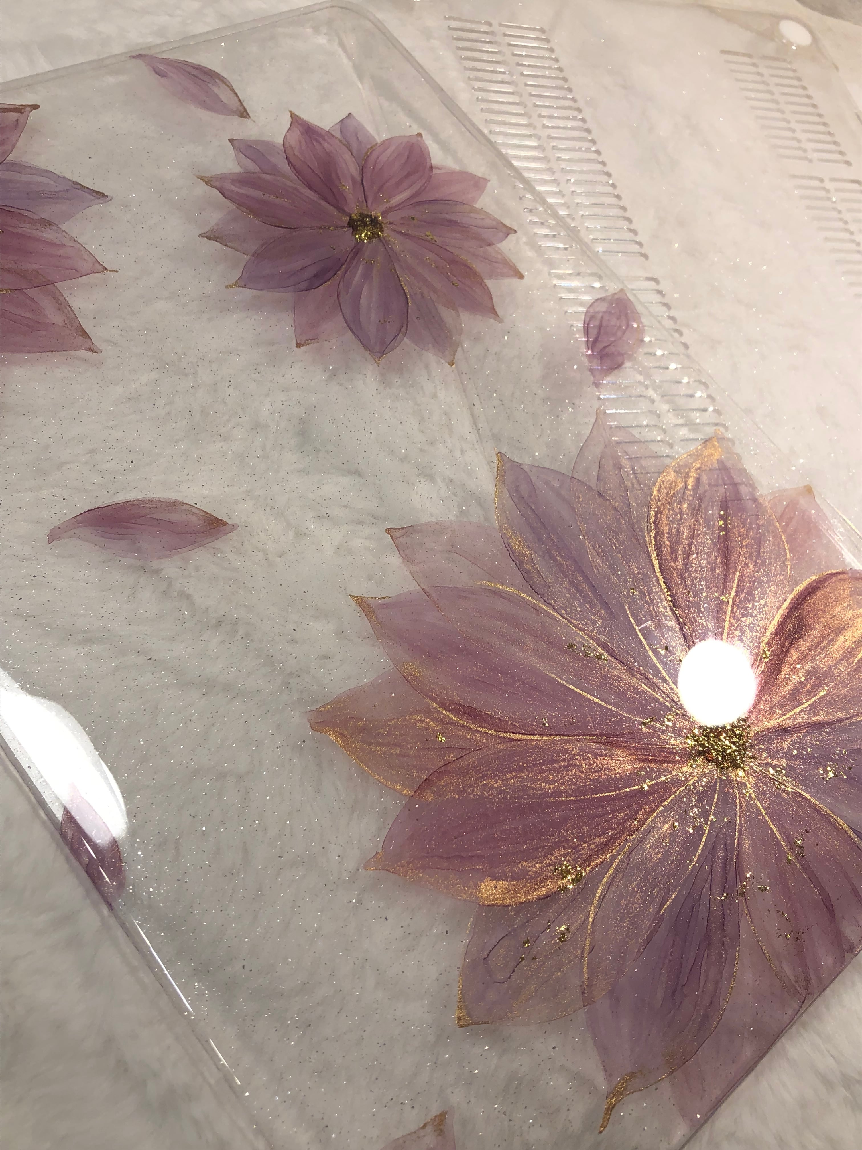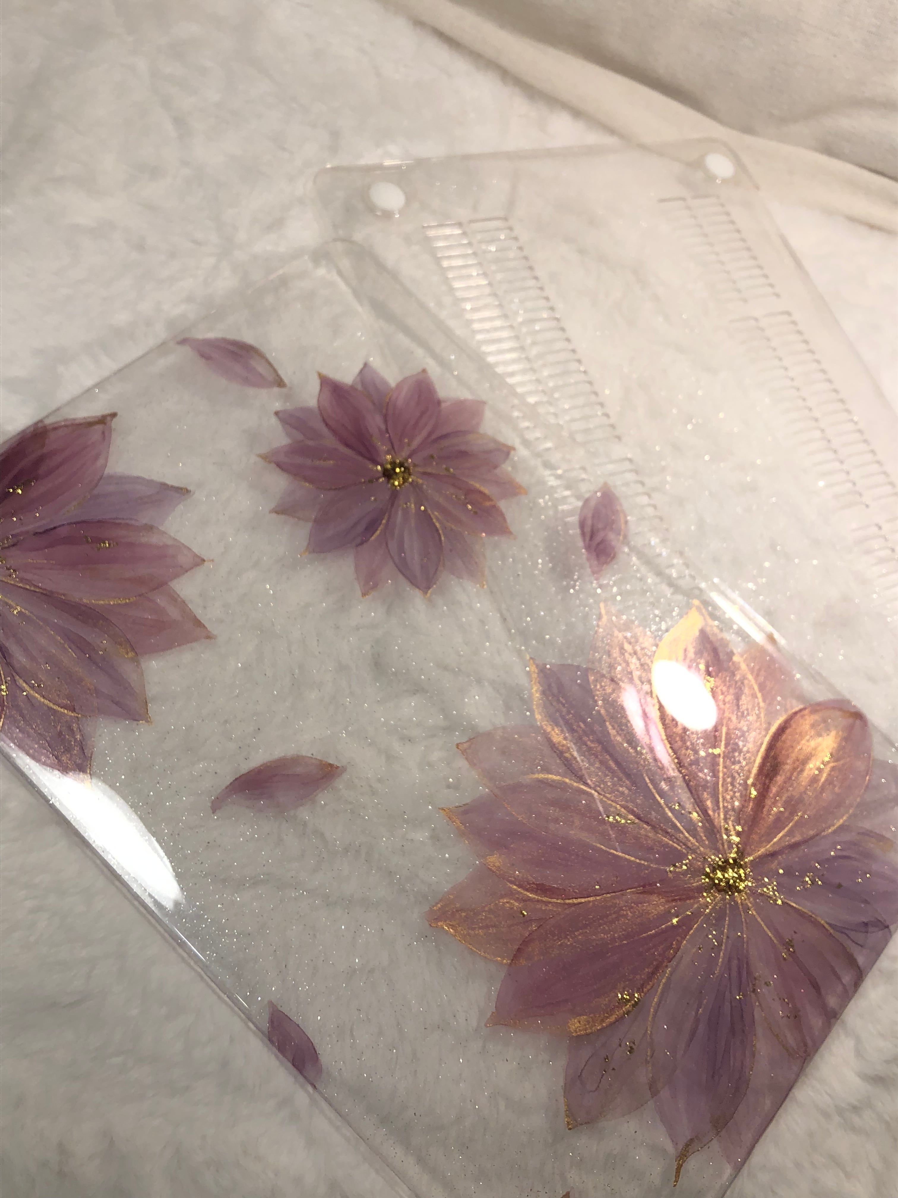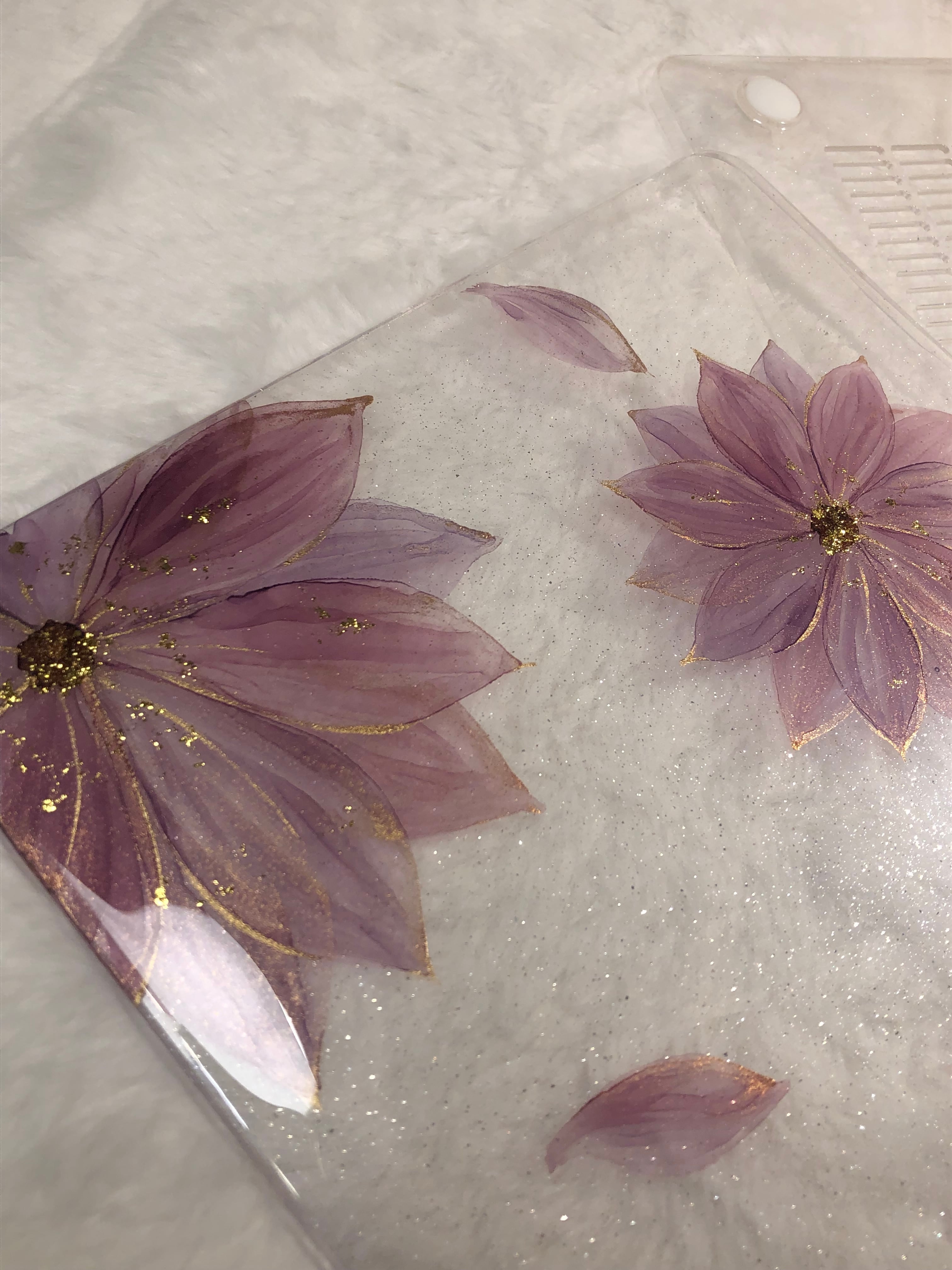キラキララメの入ったクリアケースに、当店1番人気のくすみPinkフラワーを3輪、周りに花びらが舞い散るデザインを描きました♡