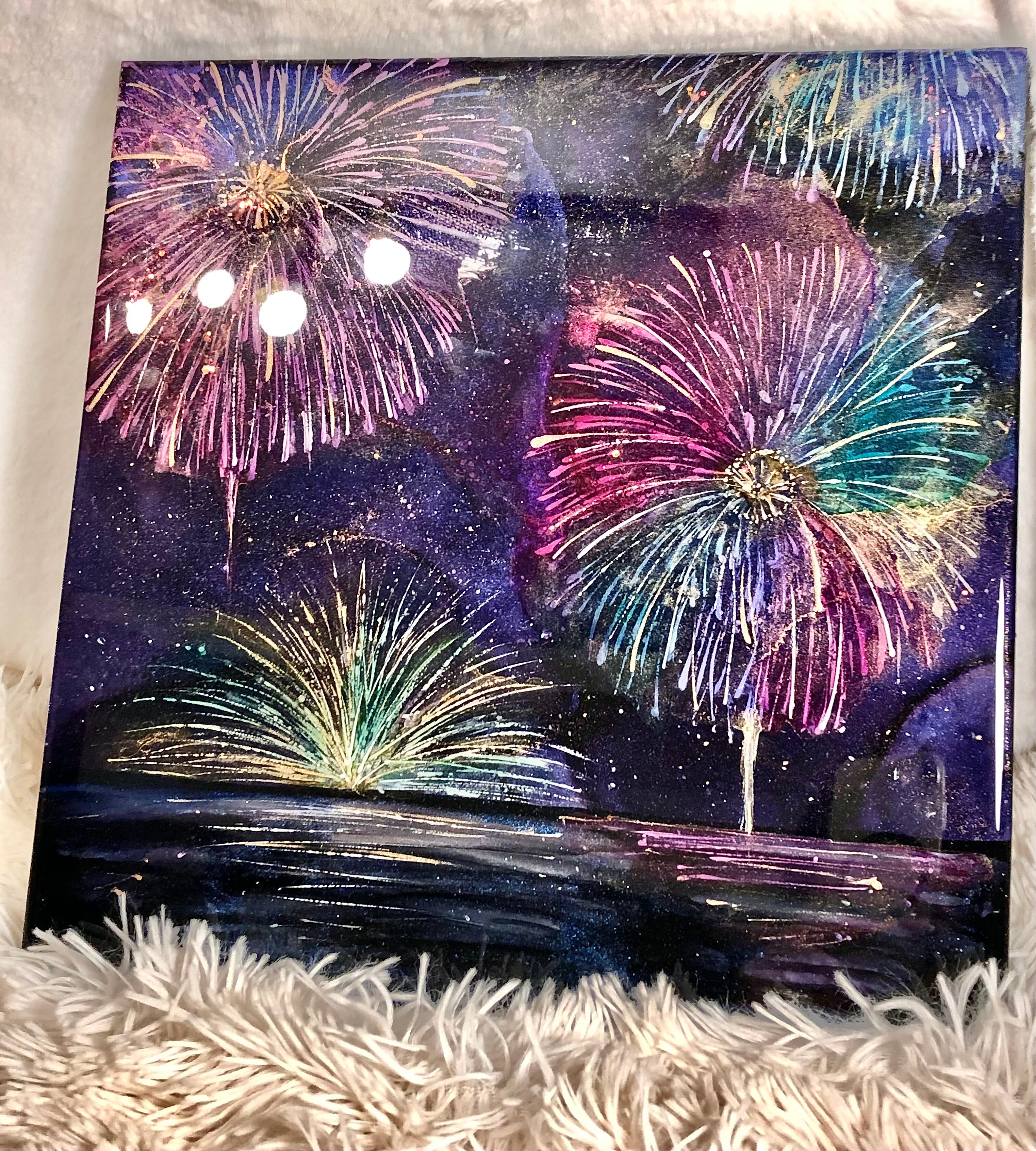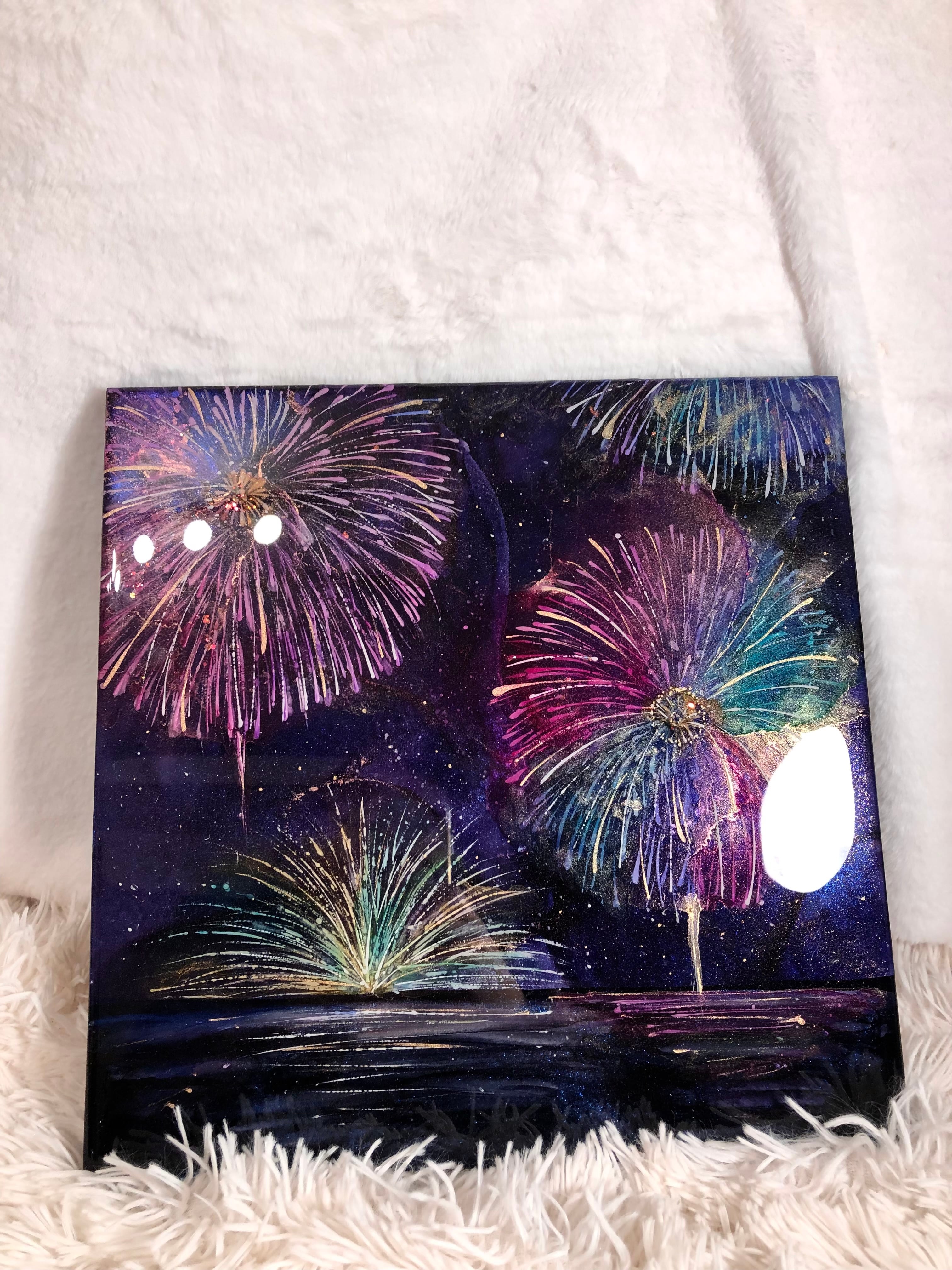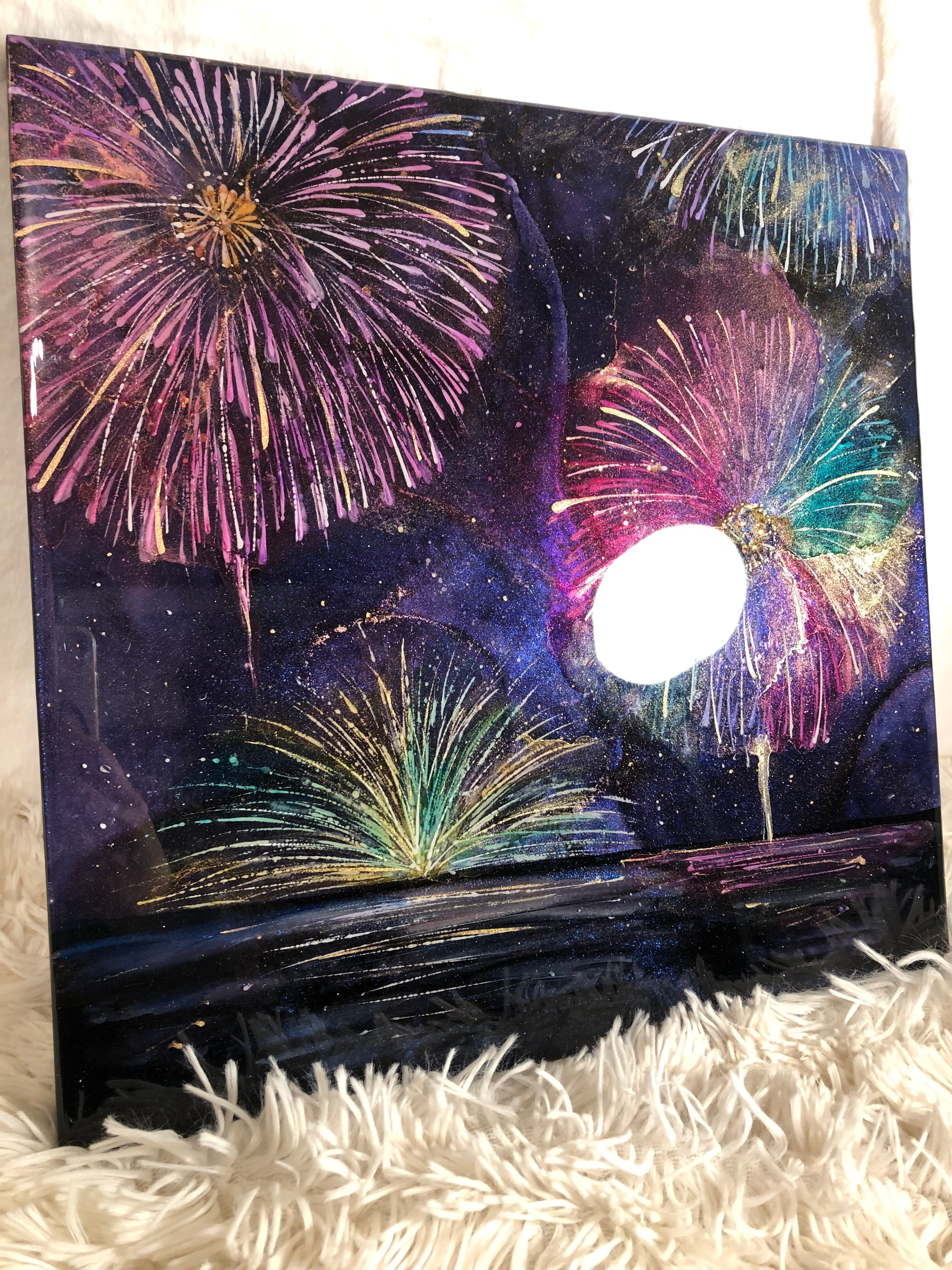 深い夜空に咲き誇る、色とりどりの花火を描いたアートパネル
