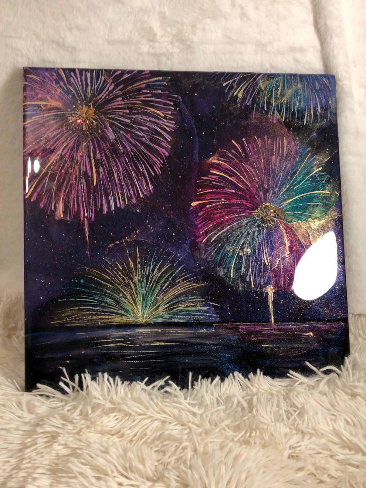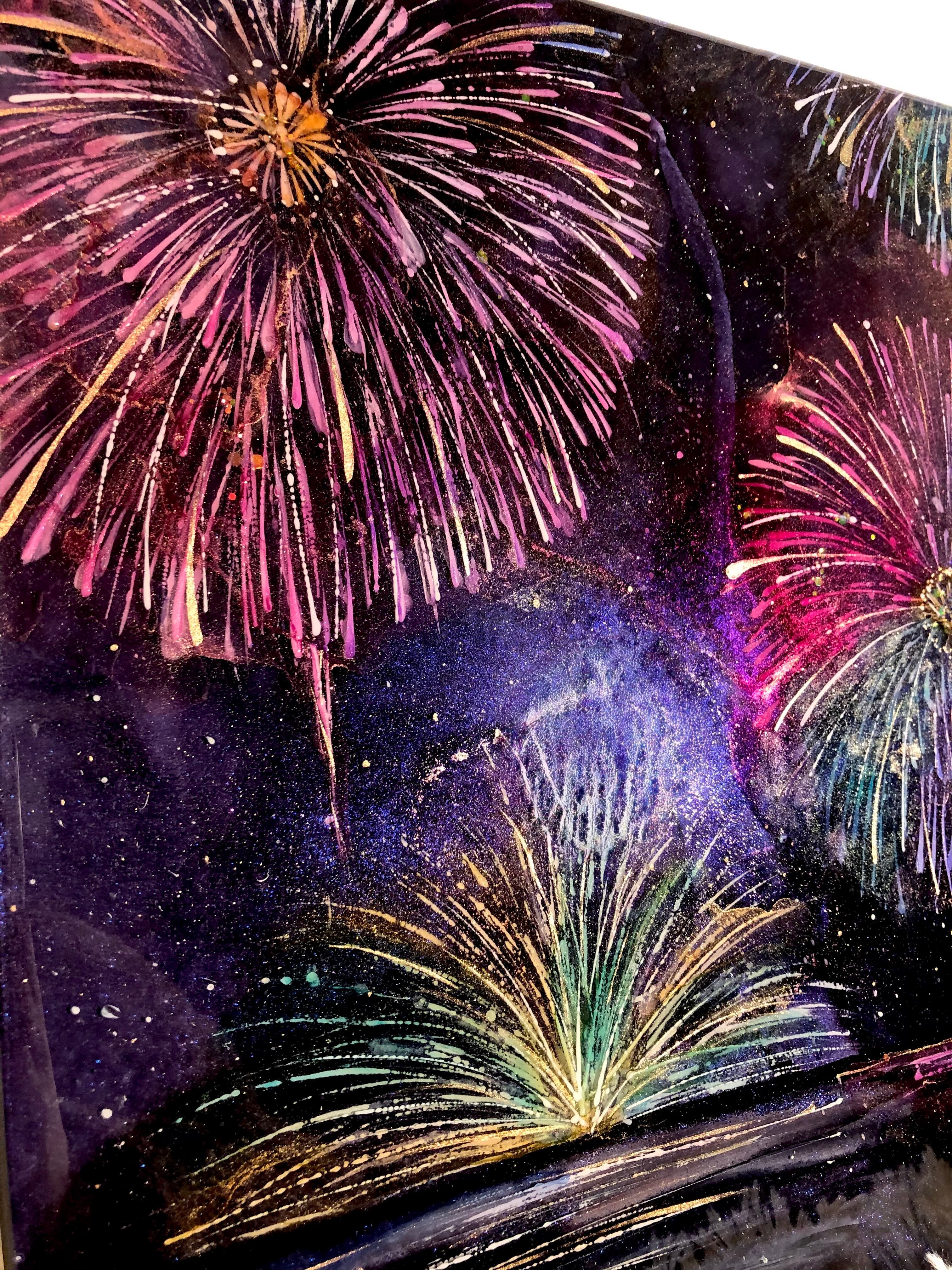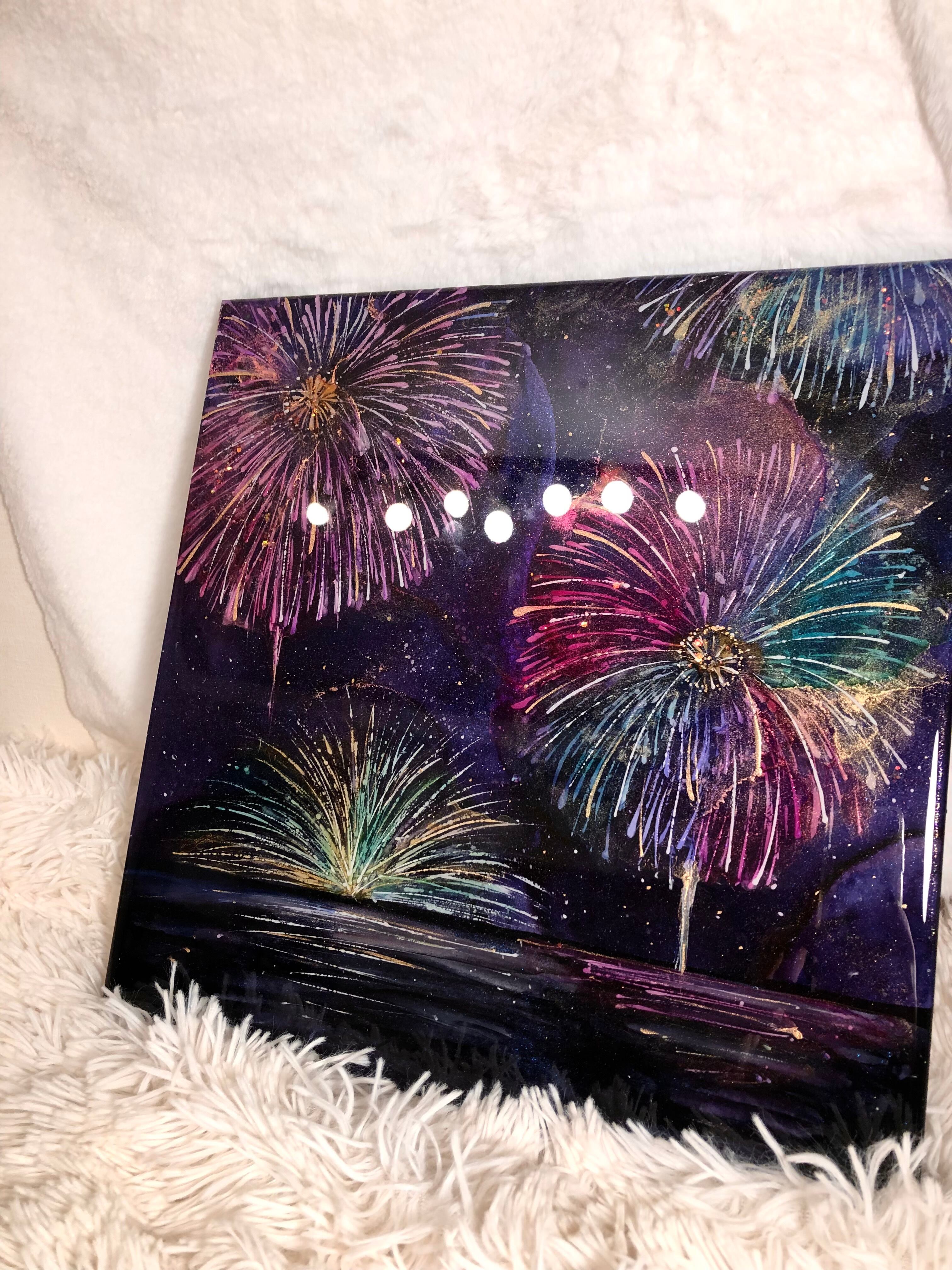 深い夜空に咲き誇る、色とりどりの花火を描いたアートパネル