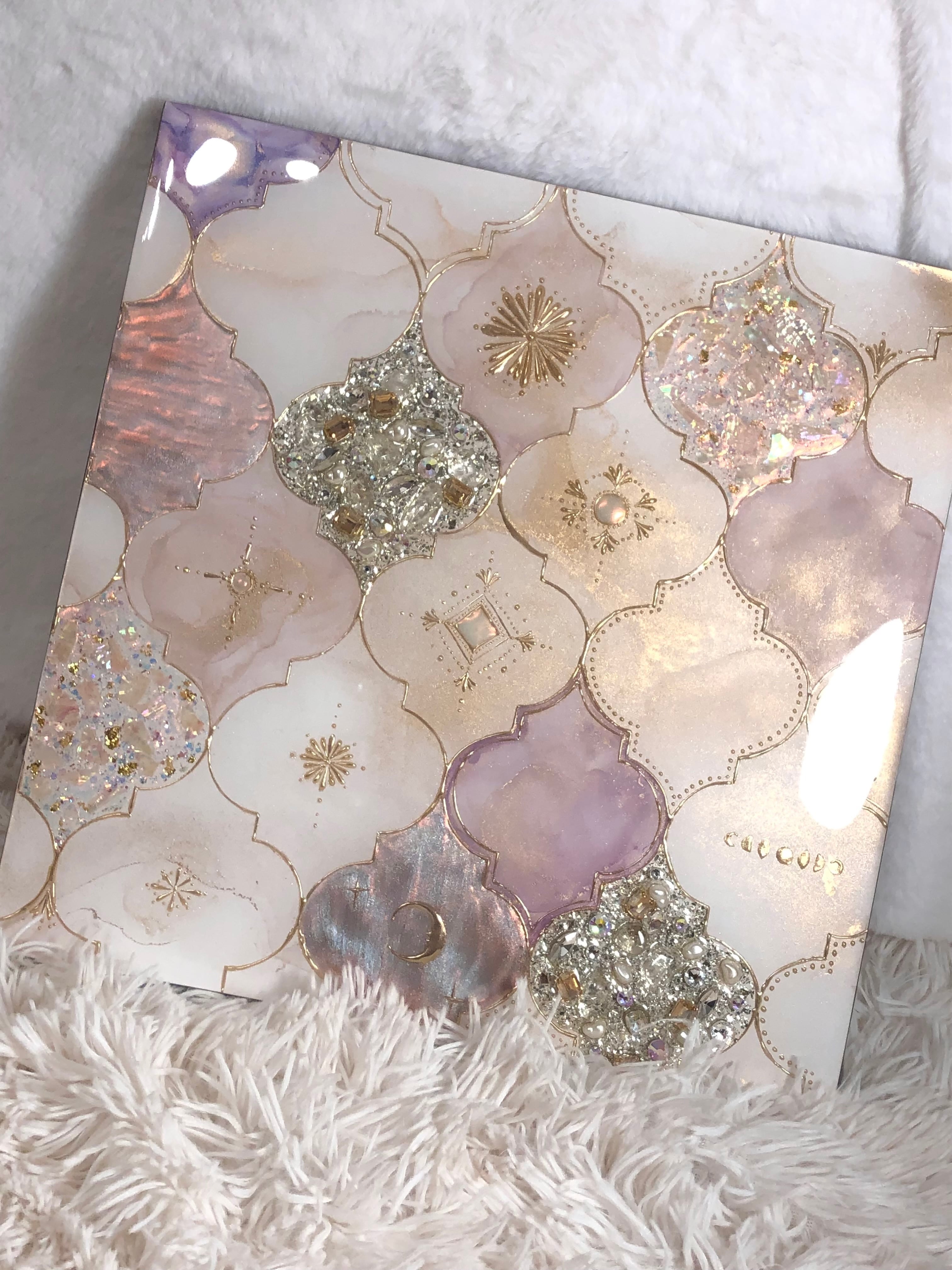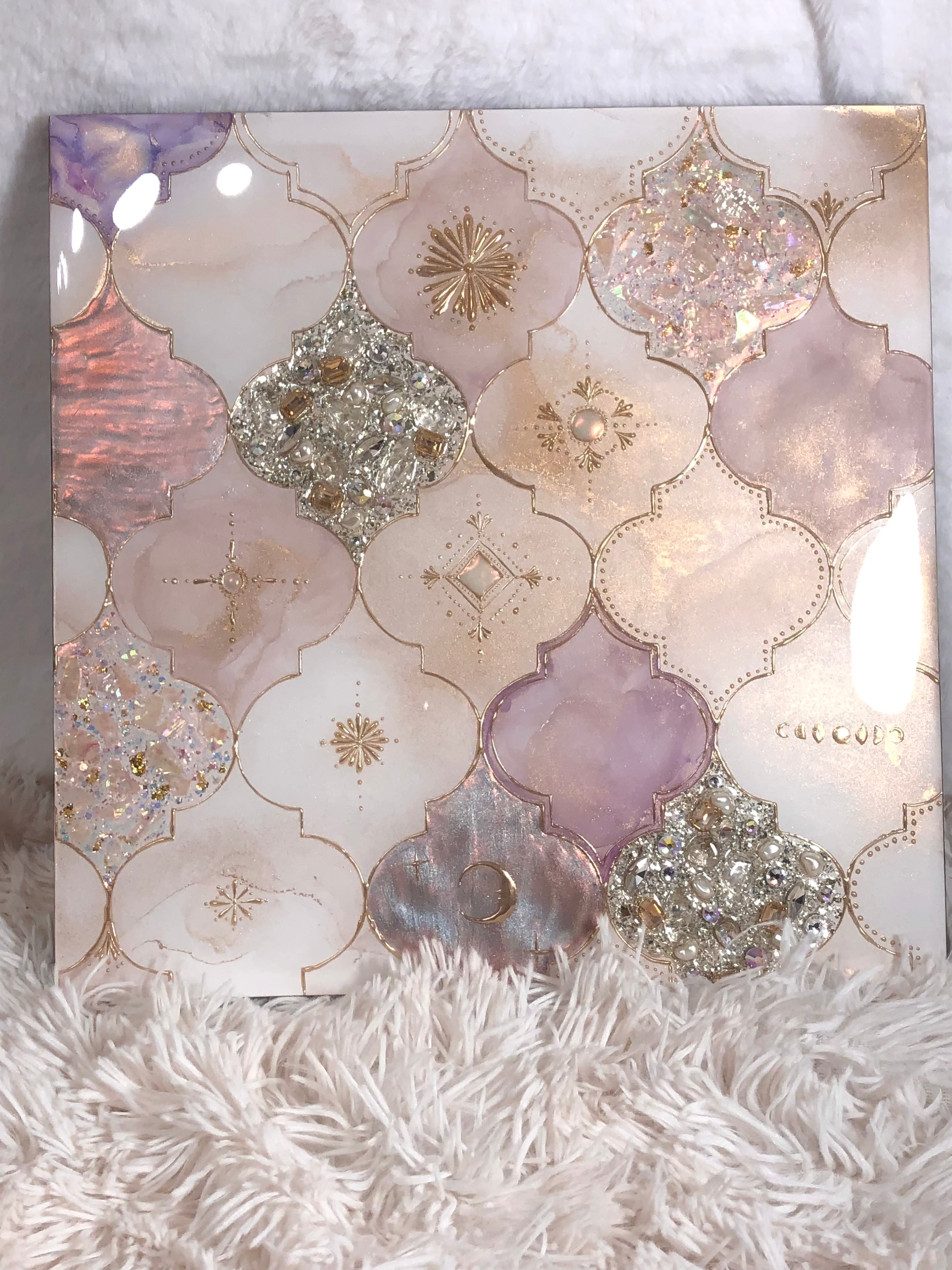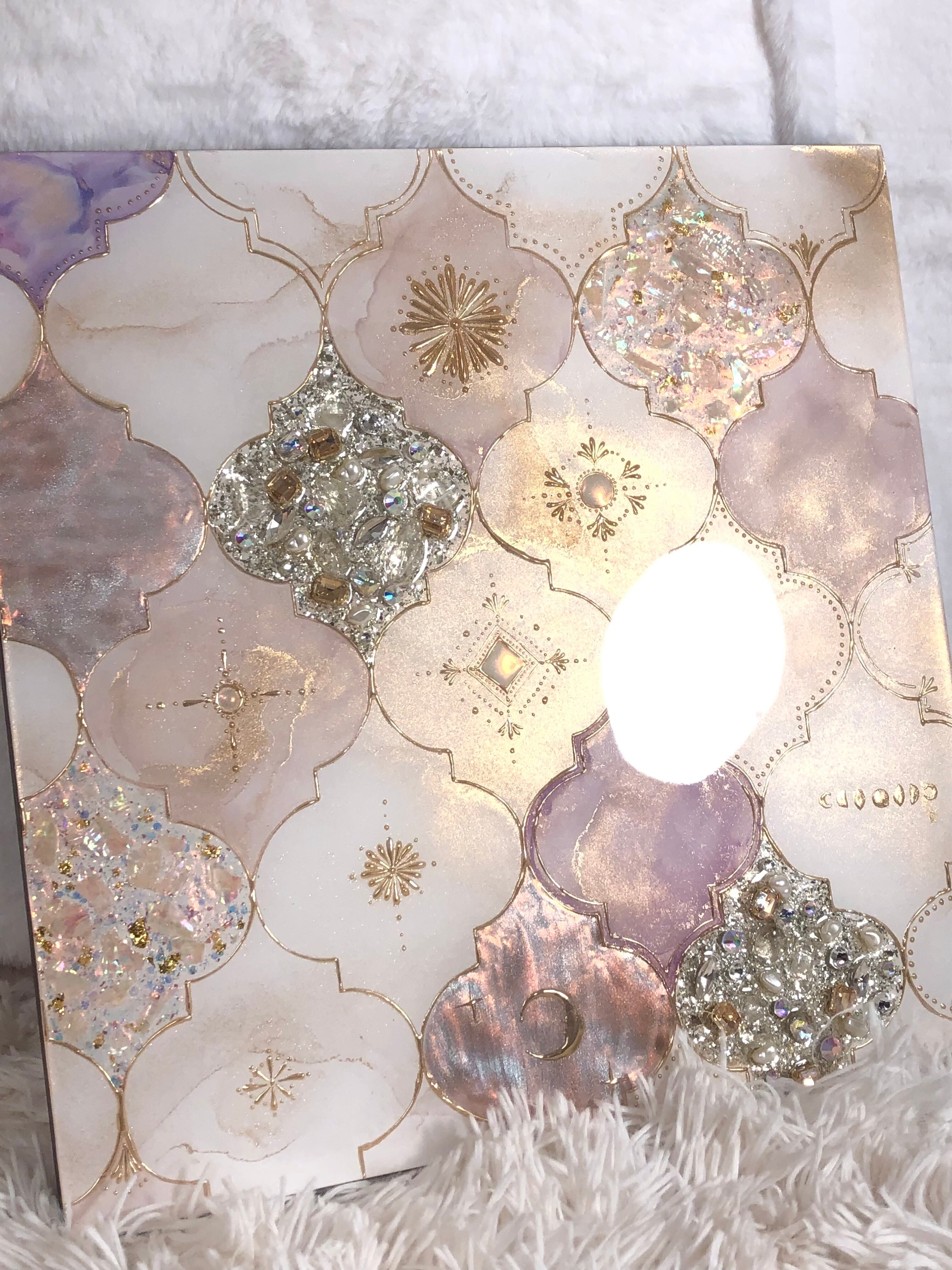 • 立体デコレーション: 一部のタイルには、パールやビジュー、細かなラメを贅沢に配置しています。平面的な絵画にはない、ジュエリーのような立体感と輝きが特徴です。