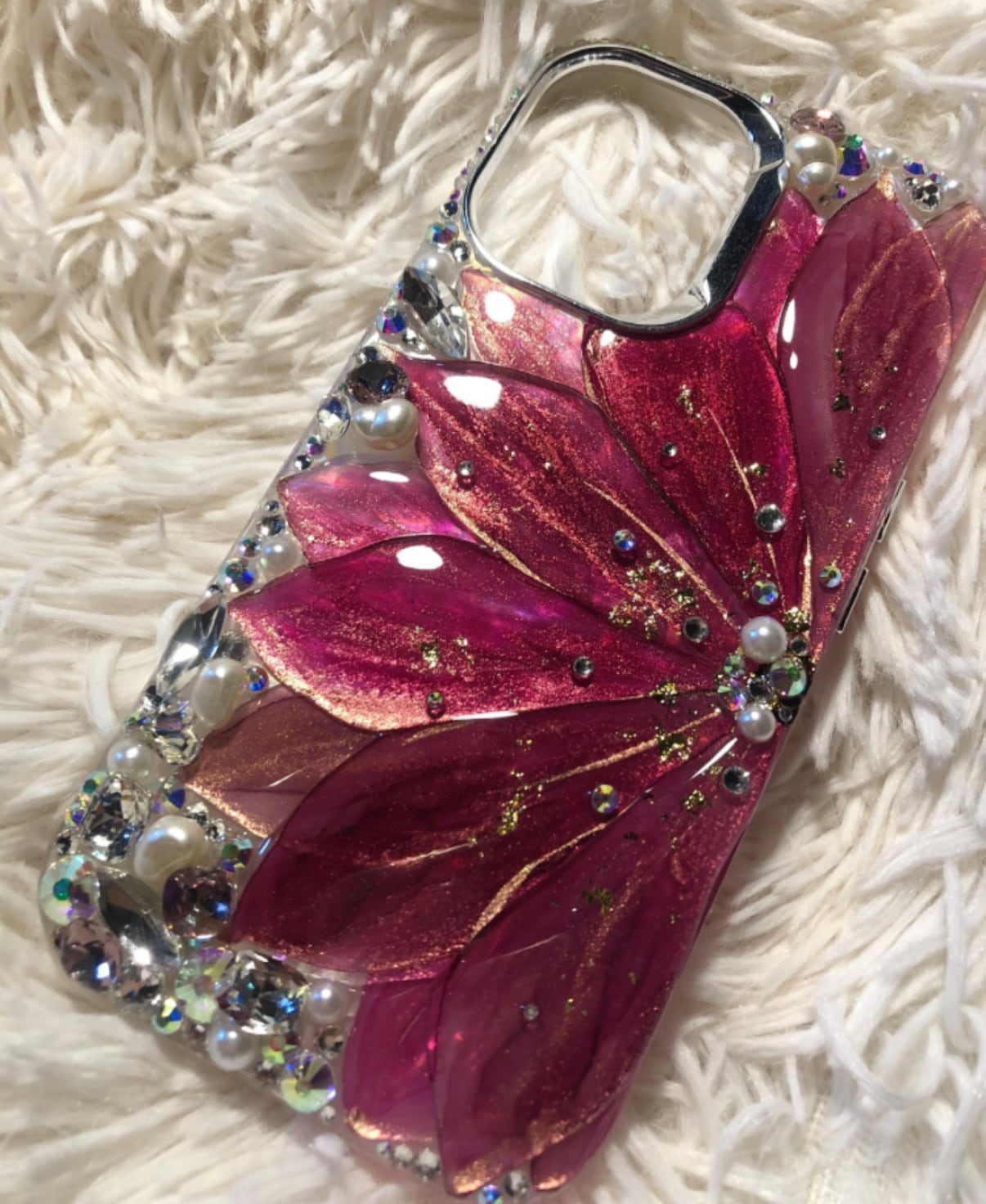 スワロフスキーストーン、パール、立体ガラスストーンを用いて花びら周りに細かく敷き詰めます。
