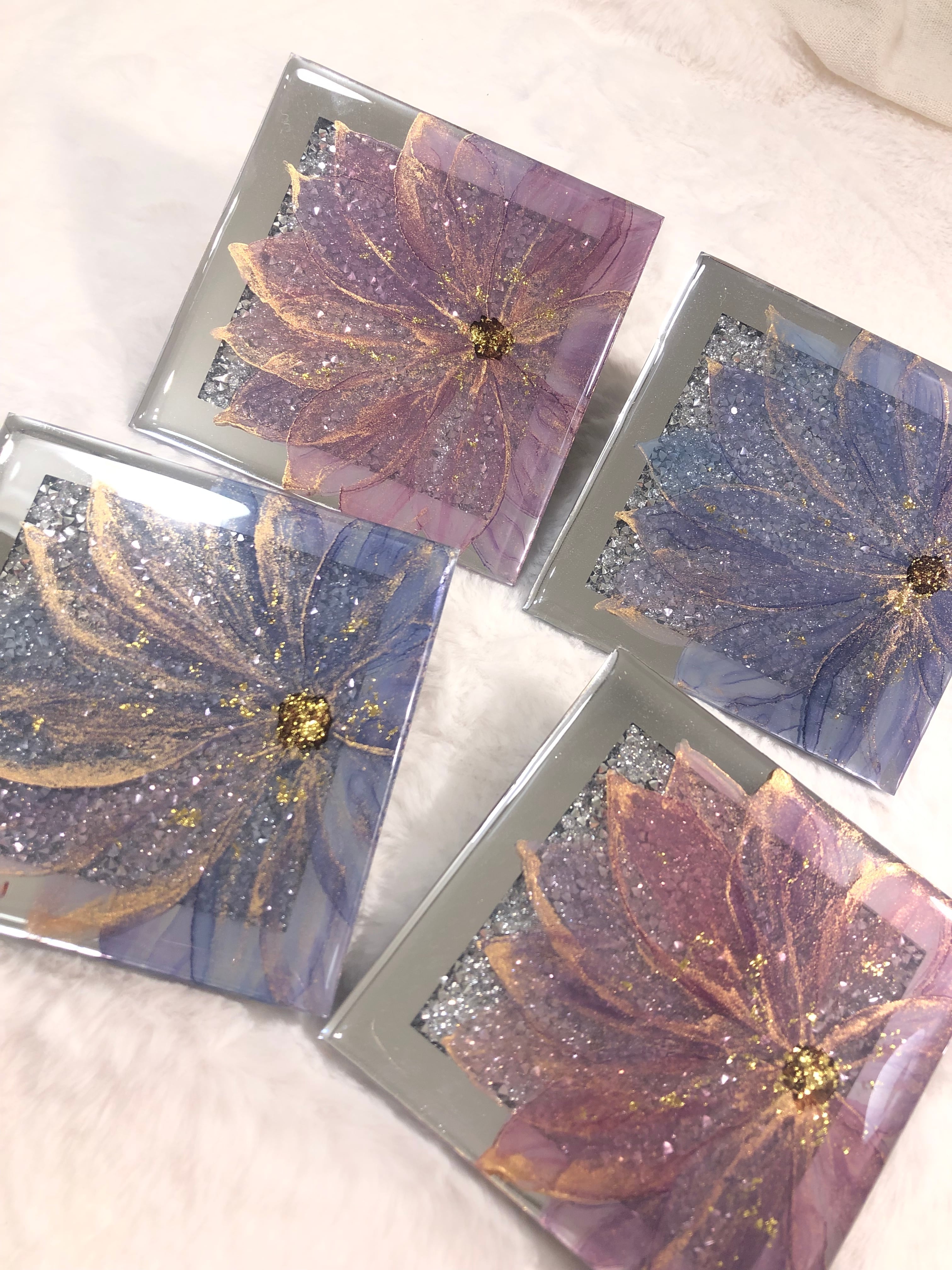 中にクリスタルが埋め込まれたガラス製のコースターにフラワーを描きました